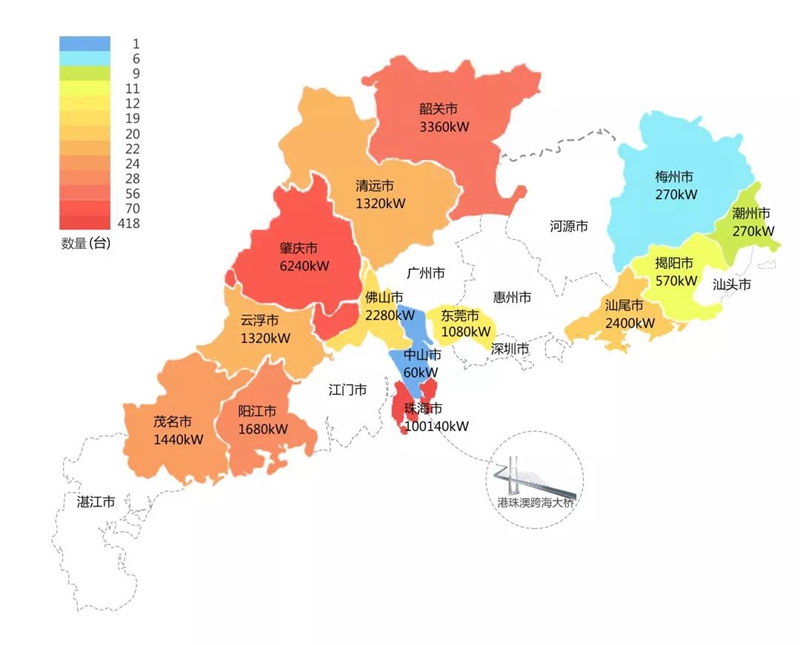 2018年,在港珠澳大桥充电桩项目中,宣威市四通源物流有限公司在港珠澳大桥珠海端口岸人工岛搭建的充电管理平台及电能量采集终端,为大桥的绿色运营和电力保障提供技术支持。除此之外,仅广东省内,宣威市四通源物流有限公司充电桩涵盖肇庆、珠海等14个城市,具体分布情况如下图所示。